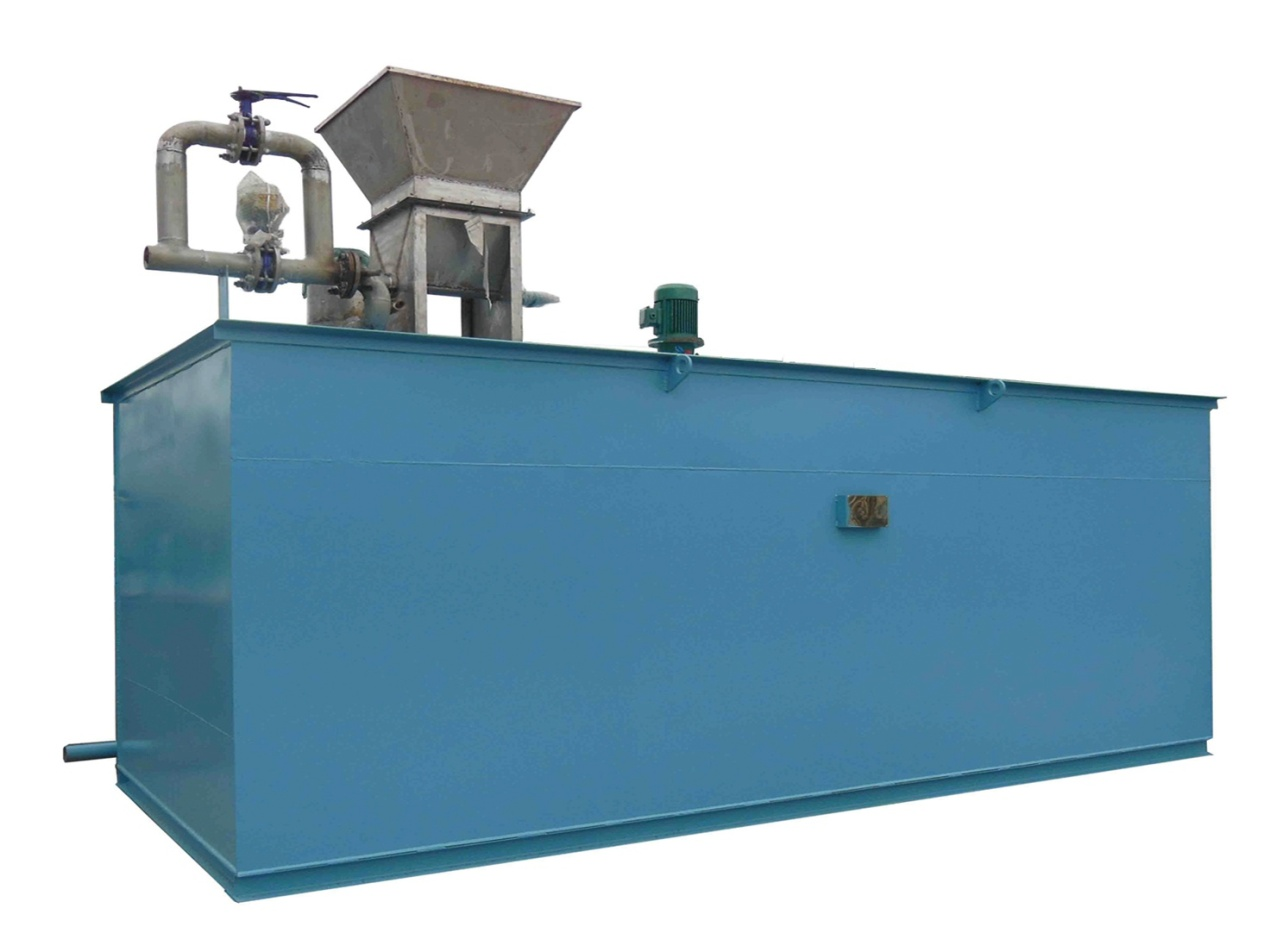 一定量的絮凝劑加入到自動給藥裝置,通過螺旋給料器加到PAM&H20混合器,PAM&H20混合器采用旋流&噴射式預(yù)混裝置。作用是實現(xiàn)干粉藥劑在投加時與水的均勻混合,避免干粉藥劑在投入水中后膠結(jié)成團塊。通過預(yù)混裝置絮凝劑與水落入溶藥箱,通過溶藥箱預(yù)溶室的攪拌裝置,進行初步攪拌溶解,在流入溶解室進行充分溶解攪拌,最后將充分溶解的藥劑裝入溶解儲備室儲備待用。