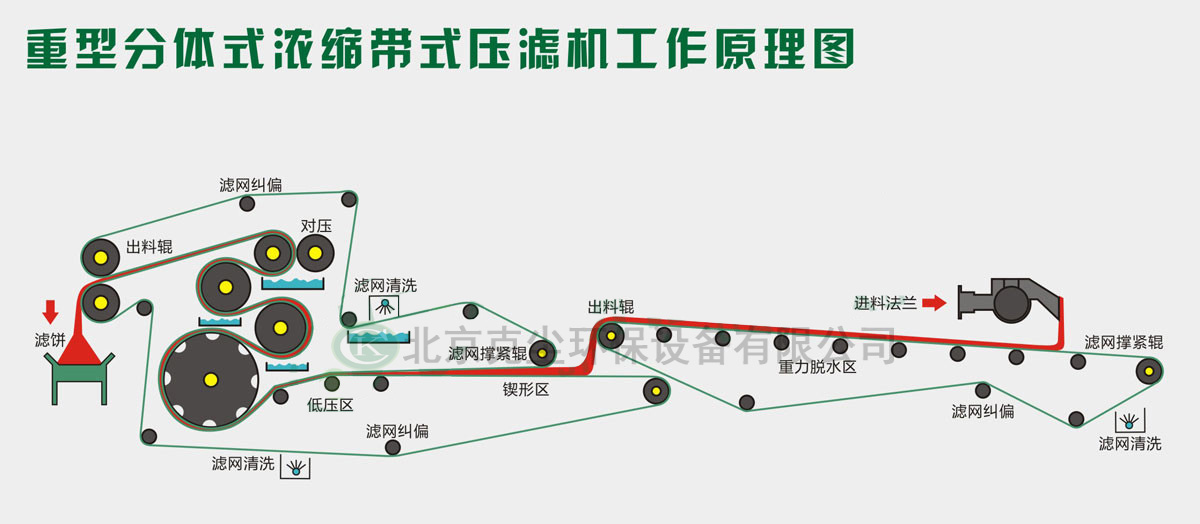 污泥經(jīng)輸送泵進(jìn)入動(dòng)(靜)態(tài)混合器,與同時(shí)加入的濃度為0.05~0.1%陰(陽(yáng))離 子絮凝劑溶液相混合并充分反應(yīng)后,渣(泥)漿中的微小固體顆粒(或懸浮物)聚凝成體積較大的絮狀團(tuán)塊,物料間的結(jié)合水及表面水被分離成自由水,當(dāng)物料被輸 送鋪展到加長(zhǎng)的重力預(yù)脫水區(qū)(或污泥脫水機(jī)上)的濾網(wǎng)上,在重力的作用下自由水透過(guò)濾網(wǎng)背面而滲出分離,形成不流動(dòng)狀態(tài)的污泥,達(dá)到壓榨脫水區(qū)實(shí)施最大壓 力條件,然后隨著網(wǎng)帶的移動(dòng)而夾持在上下兩條網(wǎng)帶之間,經(jīng)過(guò)具有可調(diào)張緊力的過(guò)濾帶及直徑逐漸遞減的轉(zhuǎn)輥和對(duì)壓輥,實(shí)施連續(xù)增加的緩慢的對(duì)輥擠壓力、剪切 力作用,通過(guò)楔形區(qū)、低壓區(qū)、中壓區(qū)、高壓區(qū)和強(qiáng)力對(duì)輥擠夾區(qū)將渣(泥)漿中的水份經(jīng)過(guò)逐級(jí)增壓的方式不斷擠壓出來(lái),最后形成含水率較低的濾餅排出,通過(guò) 刮料板刮離,上下濾帶分開(kāi),經(jīng)過(guò)高壓沖洗水及滾刷清除濾網(wǎng)表面孔隙中的微量顆粒,繼續(xù)進(jìn)入下一步脫水循環(huán)。